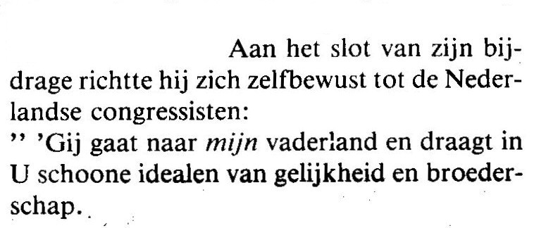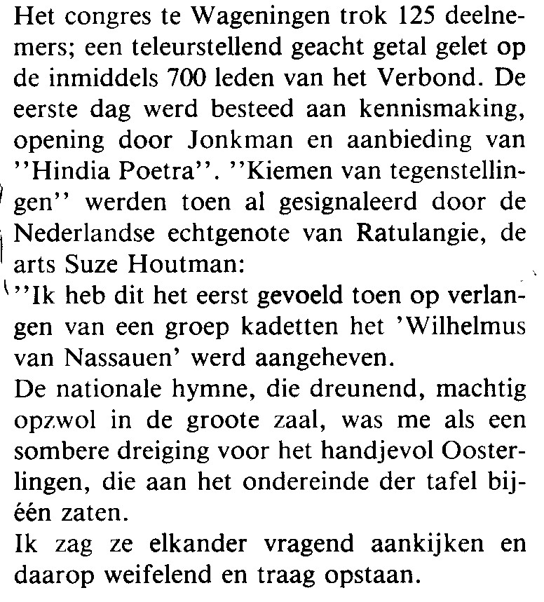 Observation by Suze Houtman (at that time the spouse of Sam Ratulangie) she was working at her doctorate in medicine at the UVA. She described that she observed seeds of contradiction in the reluctance of the Indonesian participants of the Congress to join in singing “Wilhelmus van Nassauen” which is the Dutch National Anthem. The Indonesians looked at each other with a questioning expression but in order to maintain good manners and to be polite, did stand up slowly.