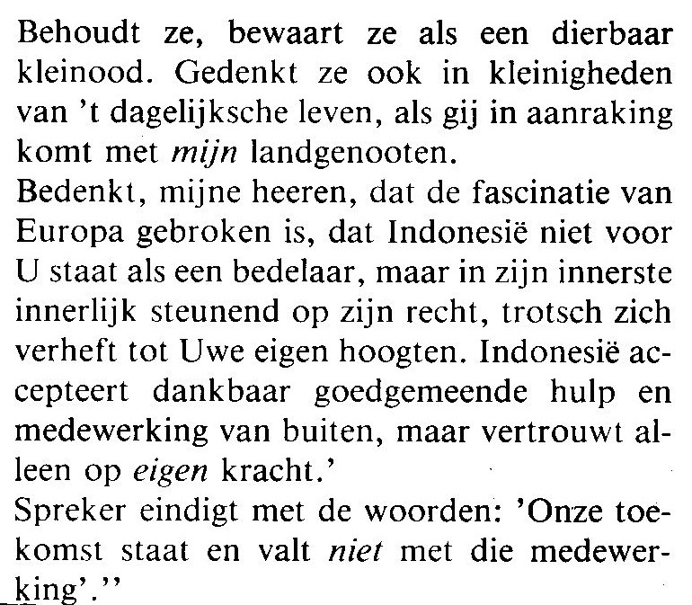 - Sam Ratulangie was addressing those who will come to his country later, and asked them to keep the memories of equality and brotherhood obtained at this congress, “keep it as a souvenir and remember it in your daily life when you are in contact with my people. Remember, gentlemen, that the fascination of Europe is broken and that Indonesia stands in front of you not as a beggar but in his deepest inside relying on his right, rises himself with pride equal to your height. Indonesia will gratefully accept sincere help and cooperation from the outside, but relies only on its own capability. Our future does not depend on this cooperation.”