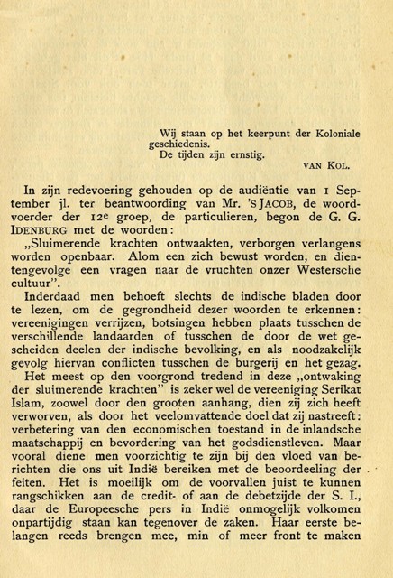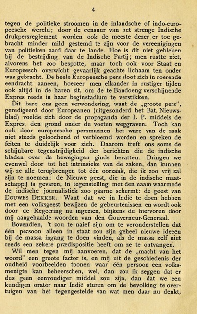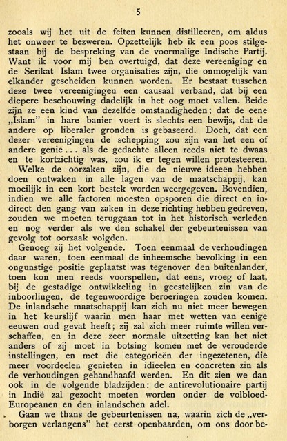 Marilah kita batasi diri pada Indonesia; di sini pun terdapat arus perlawanan nasionalis, yang terwujud dalam berbagai organisasi nasionalis, yang menentang ideologi imperial Nederland. Kata-kata keras terdengar di kedua kubu. Secara psikologis kata-kata itu sampai tingkat tertentu dapat difahami. Tetapi kendatipun demikian, adalah tugas para pemikir dan pemimpin kedua bangsa untuk menemukan pemikiran-pemikiran yang konstruktif, yang mencakup keserasian antara Timur dan Barat.
