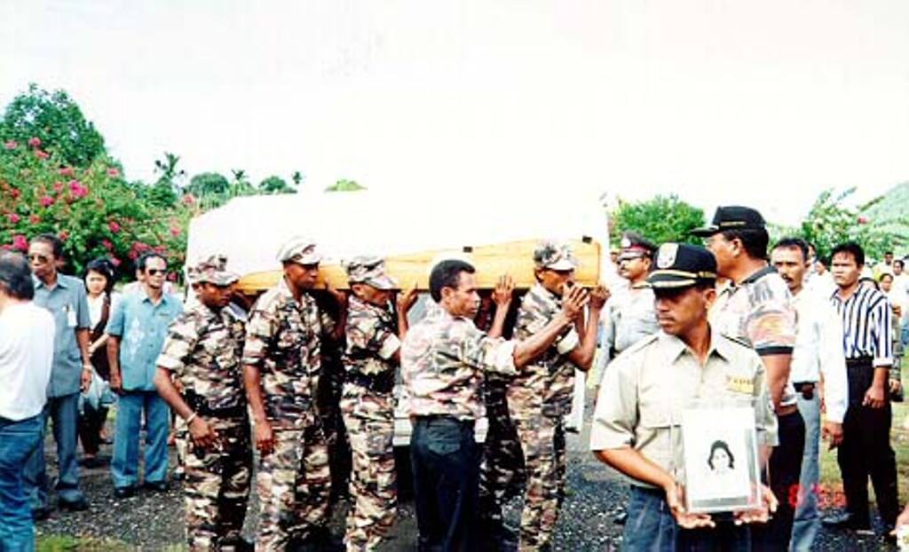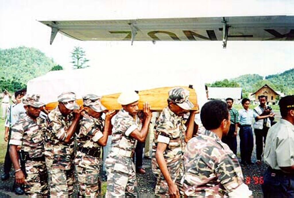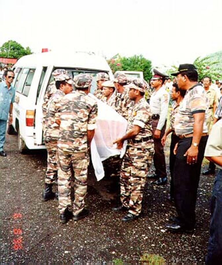 Masih di dek kapal sebelum diangkat ke daratan SeruiPeti jenazah diangkat oleh pemuda2 SeruiDiangkat sampai ke pesawat oleh pemuda Serui